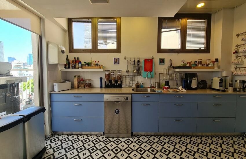 אודות חלוקת המשרד: המשרד מחולק למטבח בכניסה עם שולחנות אוכל לכלל החברה, אזור לאונג’ עם 2 תאי טלפון, 5 חדרי צוות, 3 חדרי עבודה, חדר לשיחות אחד על אחד שגם יכול . לשמש כחדר עבודה, חדר ישיבות קטן, חדר ישיבות גדול, 3 תאי שירותים ומרפסת 45 מ”ר. סה”כ 42 עמדות עבודה לא כולל חדרי ישיבות וחדרי אחד על אחד.