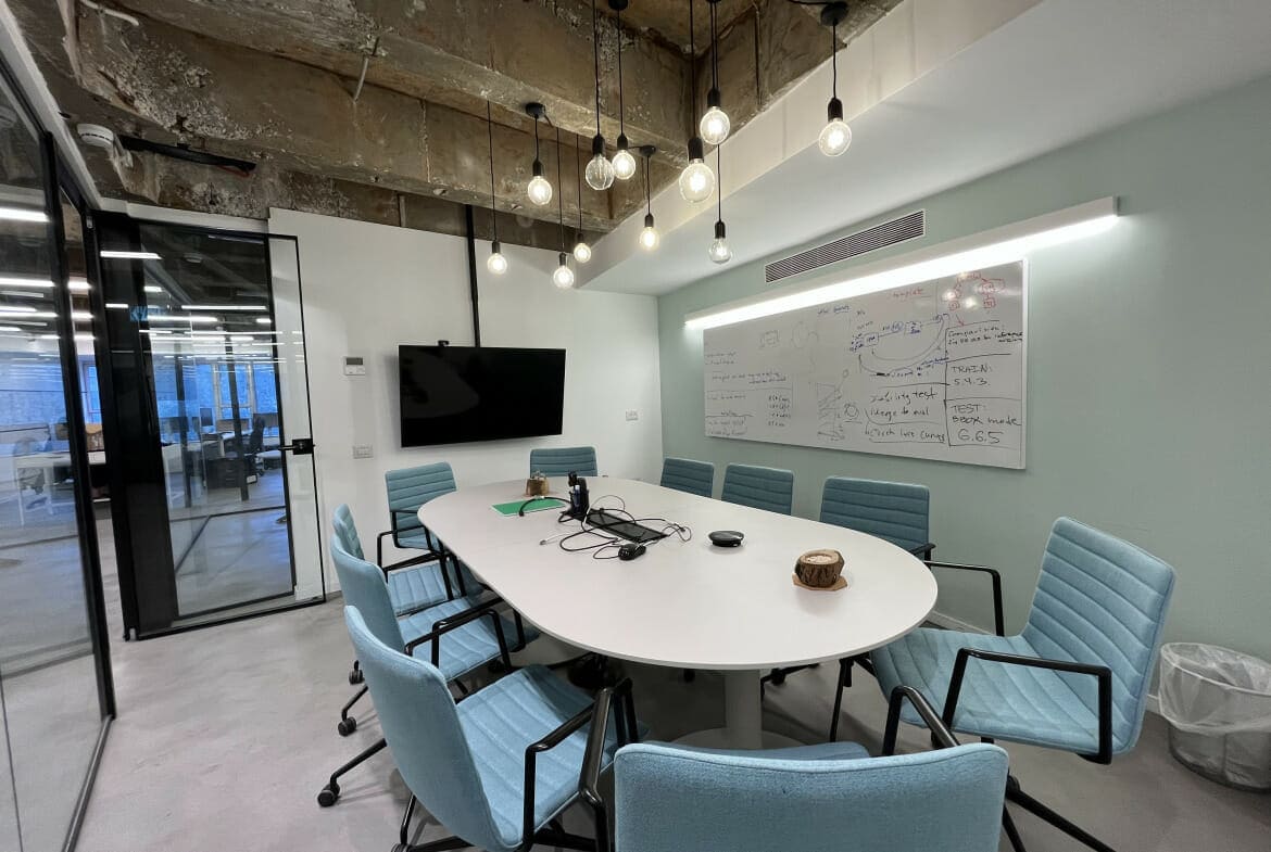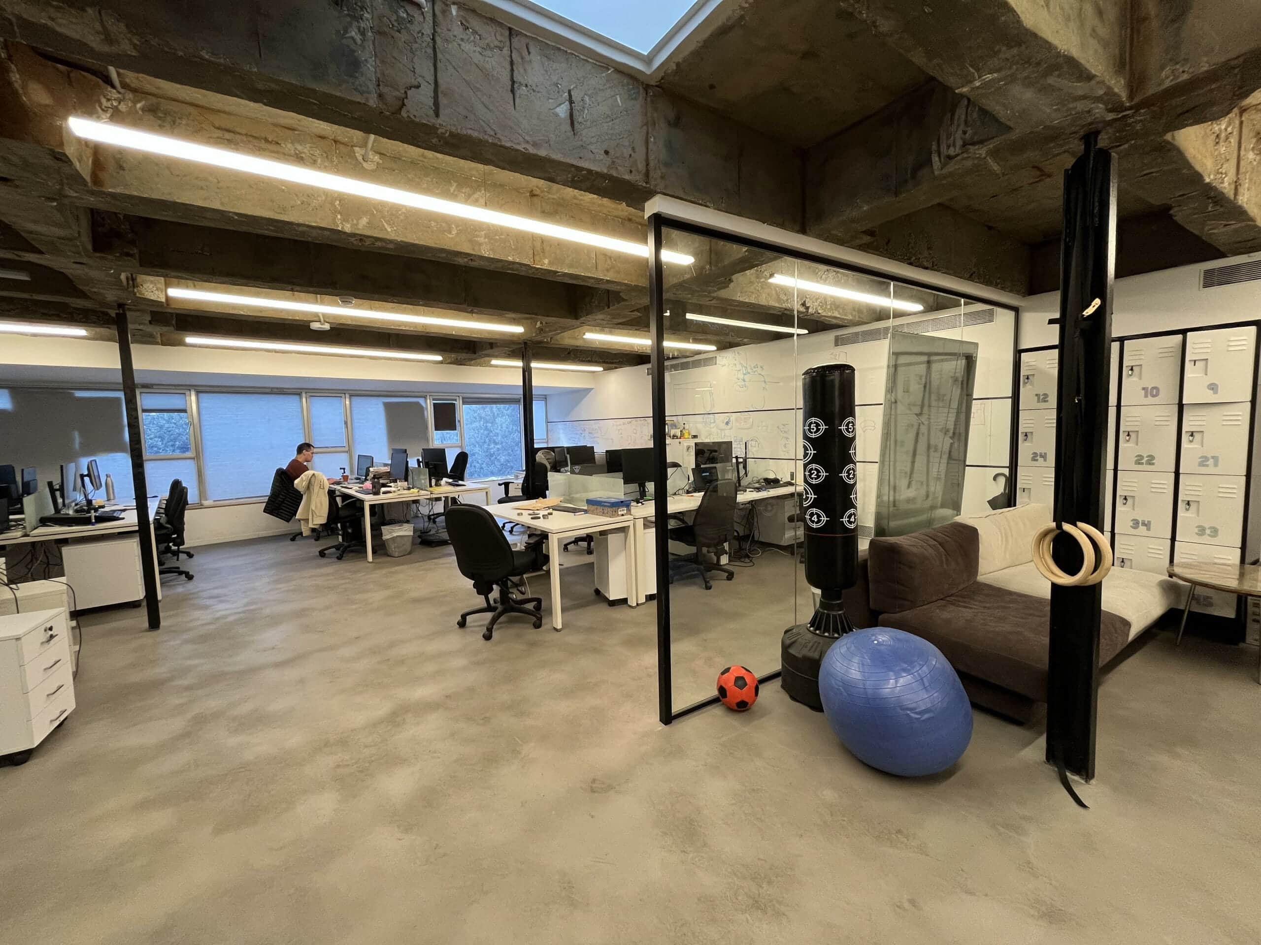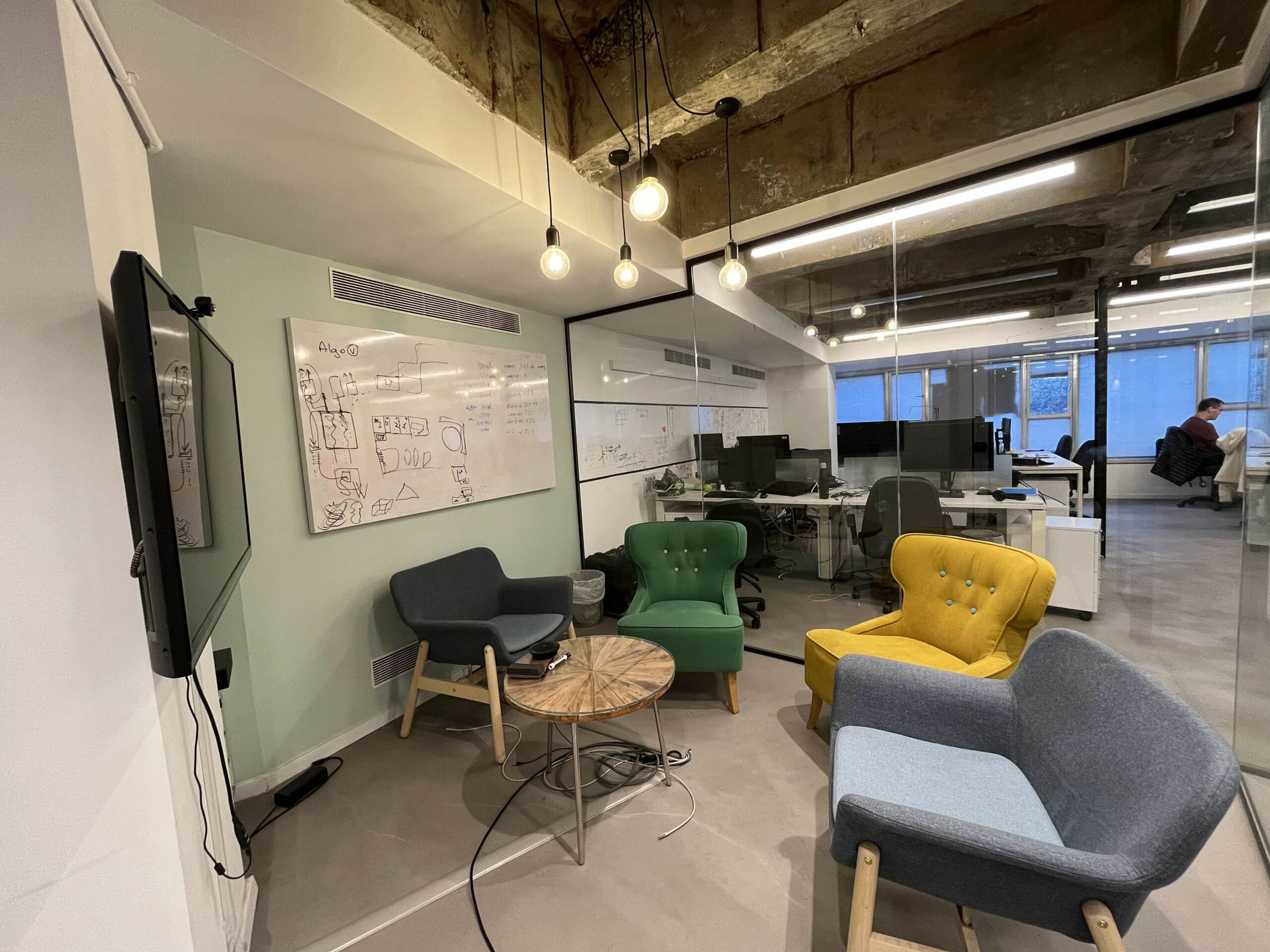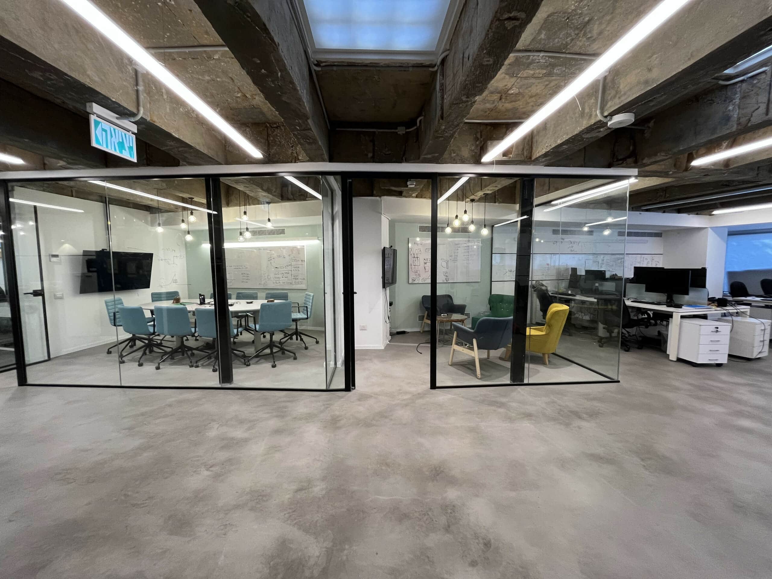 אופן ספייס שמחולק לשני חלקים סהכ 32 עמדות, 2 חדרי ישיבות,חדר מנכל, מטבח+פינת אוכל ולאונג׳