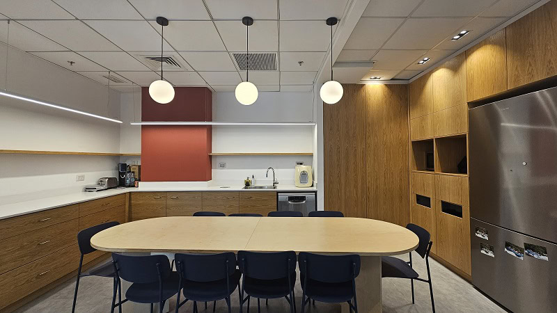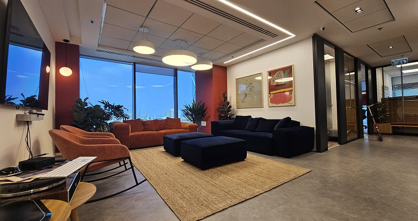 אודות חלוקת המשרד: 48 עמדות עבודה סה”כ בחלוקה הבאה – קבלה, 2 חדרי ישיבות, 2 חדר מנהל, חדר צוות, 10 חדרי עבודה, לאונג’ פינת אוכל ומטבח.
