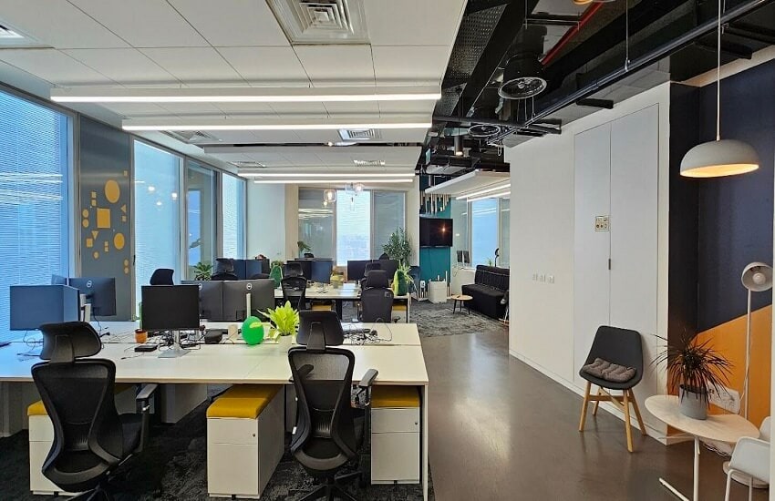 אודות חלוקת המשרד: המשרד מחולק לאזורי אופן ספייס בגדלים שונים, מספר חדרי דיונים בגדלים שונים, חלל פתוח נוסף, אזור לאונג’ ומטבח פתוח.