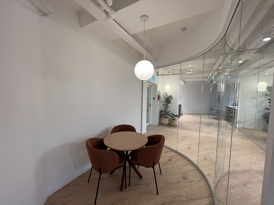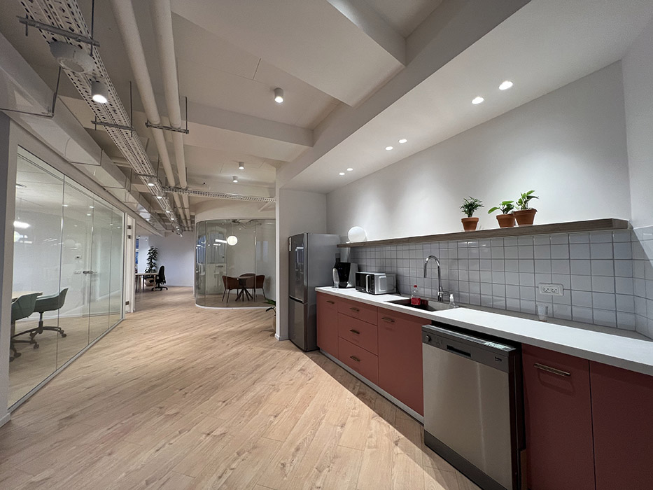 אופי חלוקת המשרד: אופן ספייס שמתאים לעד 14 עמדות עבודה, חדר ישיבות גדול ועוד חדר ישיבות קטן ואינטימי יותר. למשרד הזה יש מטבח ואזור קפיטריה מאוד רחב ומרווח.