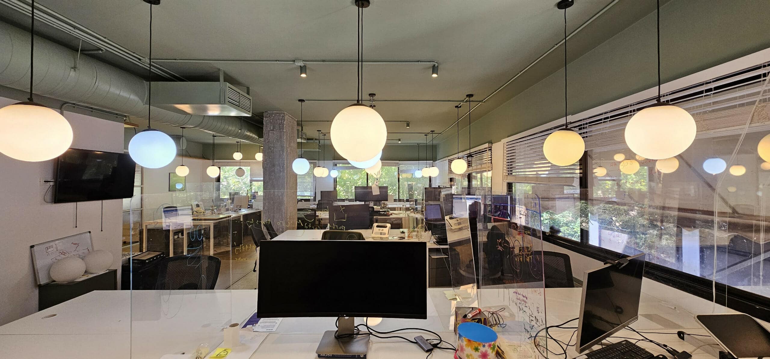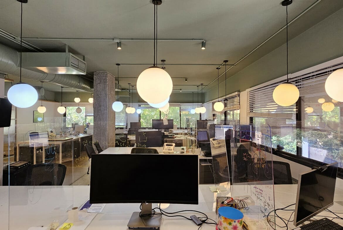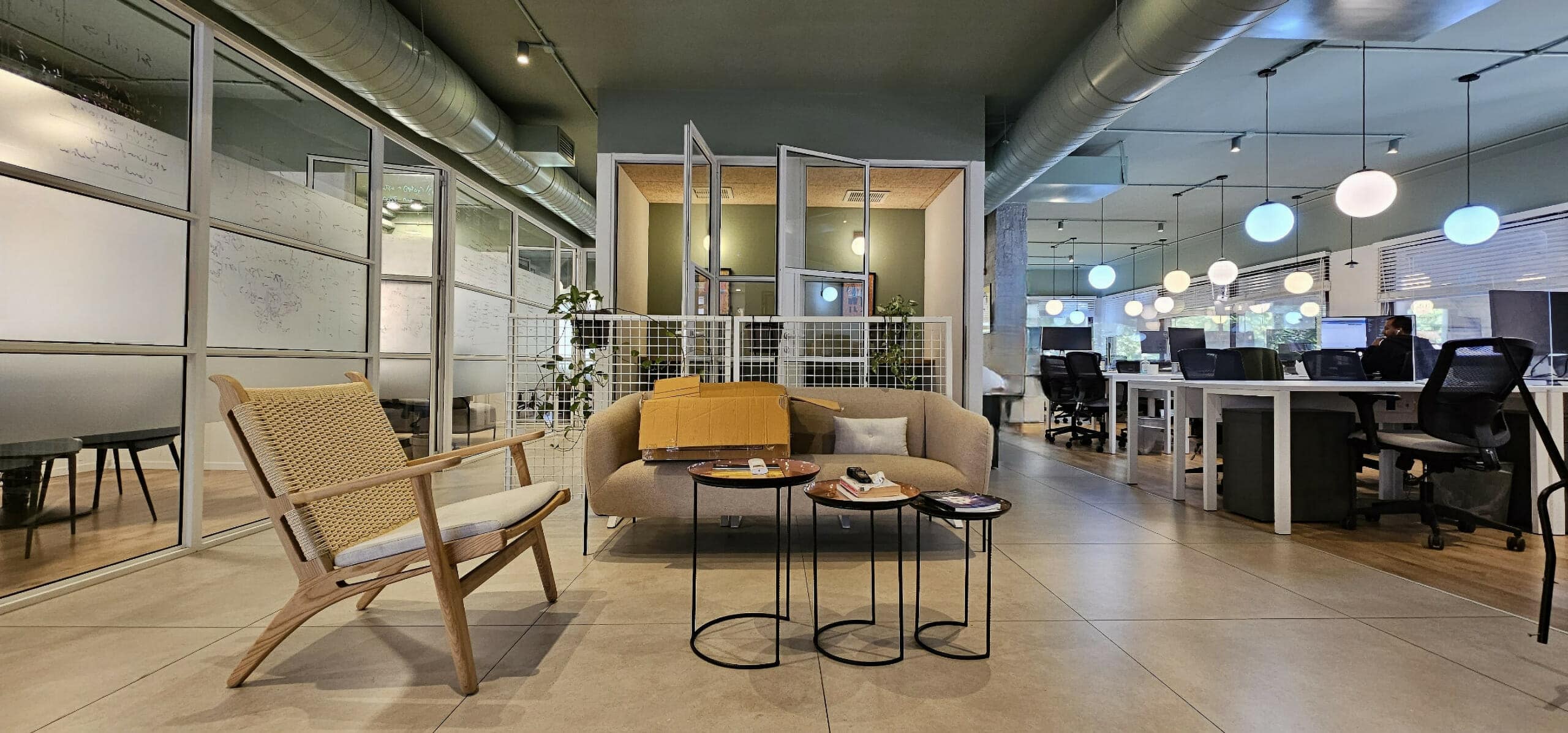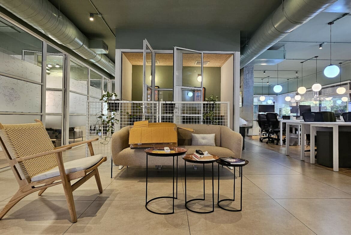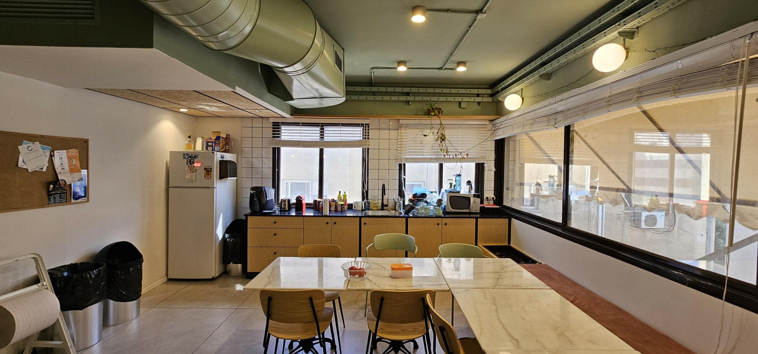 חלוקה: אופן ספייס 30 עמדות עבודה, חדר ישיבות גדול, 2 חדרי ישיבות בינוניים, 2 פון בוטים, סלון מטבח ופינת אוכל פתוחים, 2 תאי שירותים.